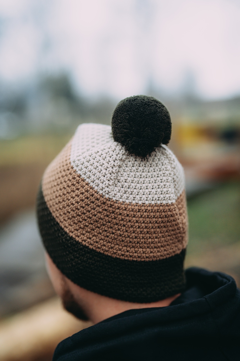 Férfi téli sapka háromszínű kivitelben pomponnal, amely fleece béléssel rendelkezik.